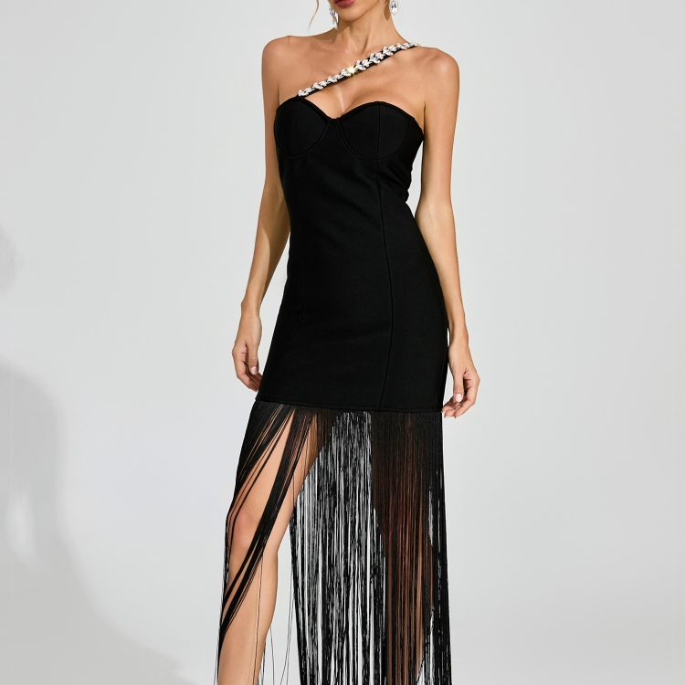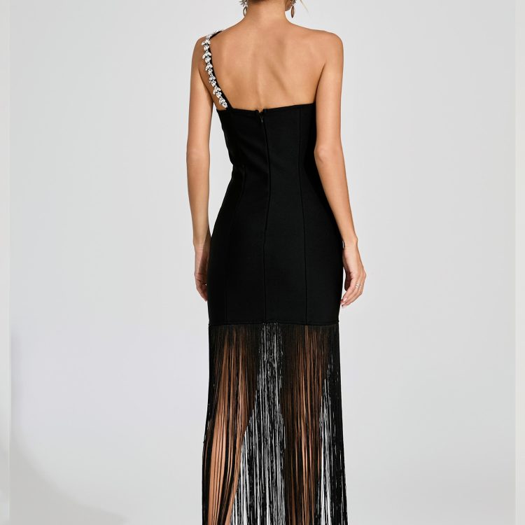 Ignite the night in the Austin Black One Shoulder Fringe Dress. This show – stopping piece features a single crystal – adorned strap. a curve – hugging bodice. and dramatic floor – grazing fringe. The sleek silhouette and bold details create a fierce. unforgettable look. perfect for red – carpet events. gala dinners. or any occasion where you want to own the spotlight with confident. glamorous style.